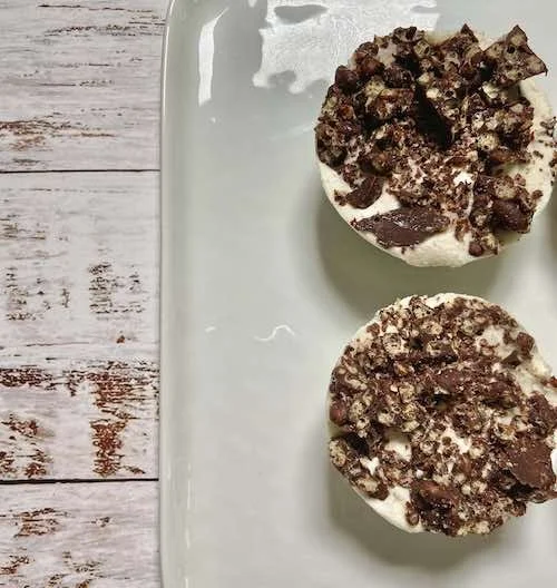 Fill the silicone cups with the ice cream mixture to the fill line inside of the cups. Take the reserved chocolate rice crispies out of the freezer and put 1-2 tsp of the mixture on top of each filled baking cup. Now place back in the freezer to harden. Try to give it 1-2 hrs. Once you are ready to serve, remove from the freezer, peel back the liner and serve.