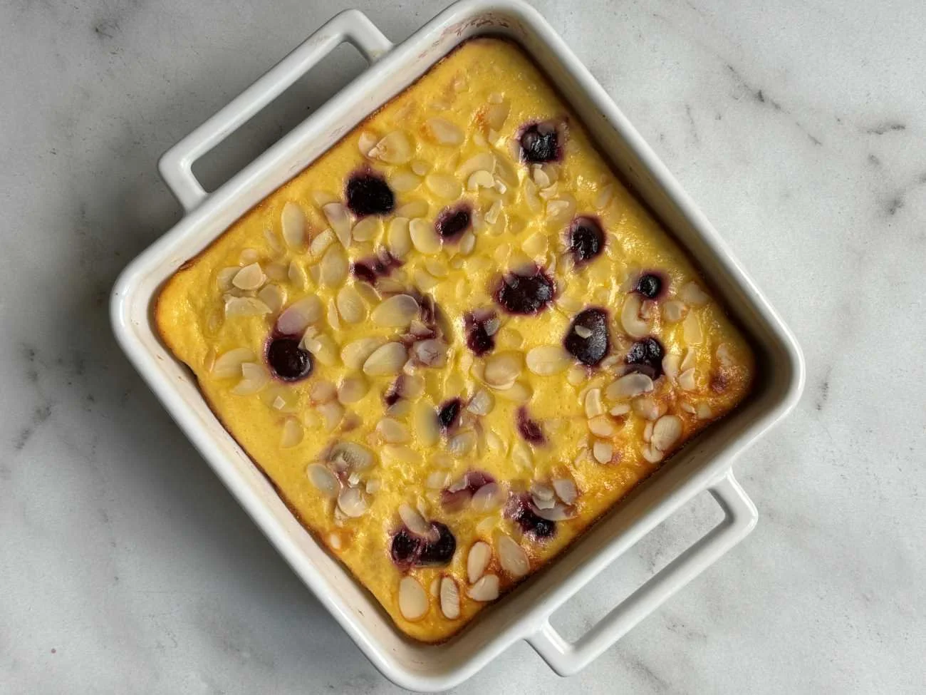 Add everything to a bowl (expect cherries & almond flakes). Mix until smooth. Add to your buttered baking dish, top with cherries & sprinkle the flakey almonds.