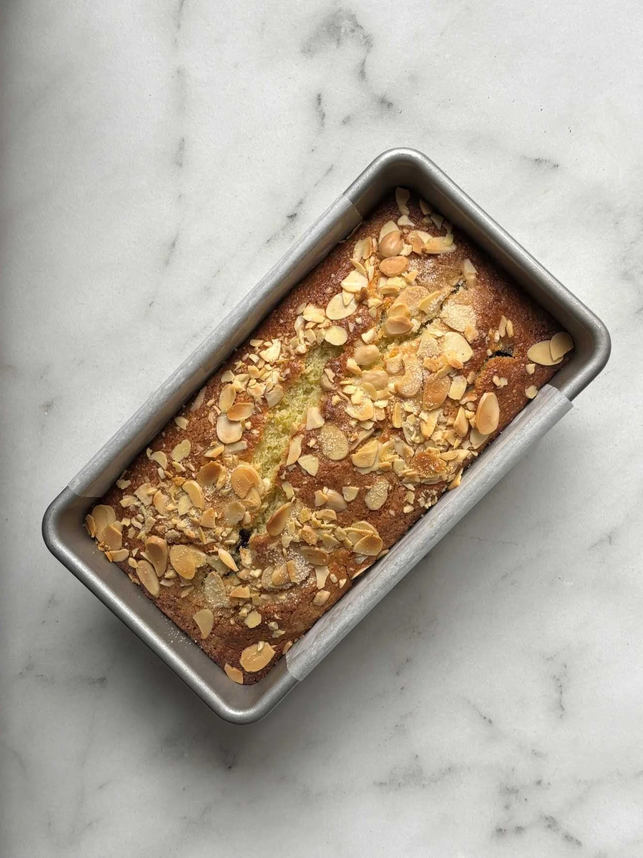 5. Pour the batter into the prepared pan, sprinkle with ¼ cup sliced almonds and a teaspoon of raw sugar and bake for 40-50 minutes, or until a toothpick inserted comes out clean.